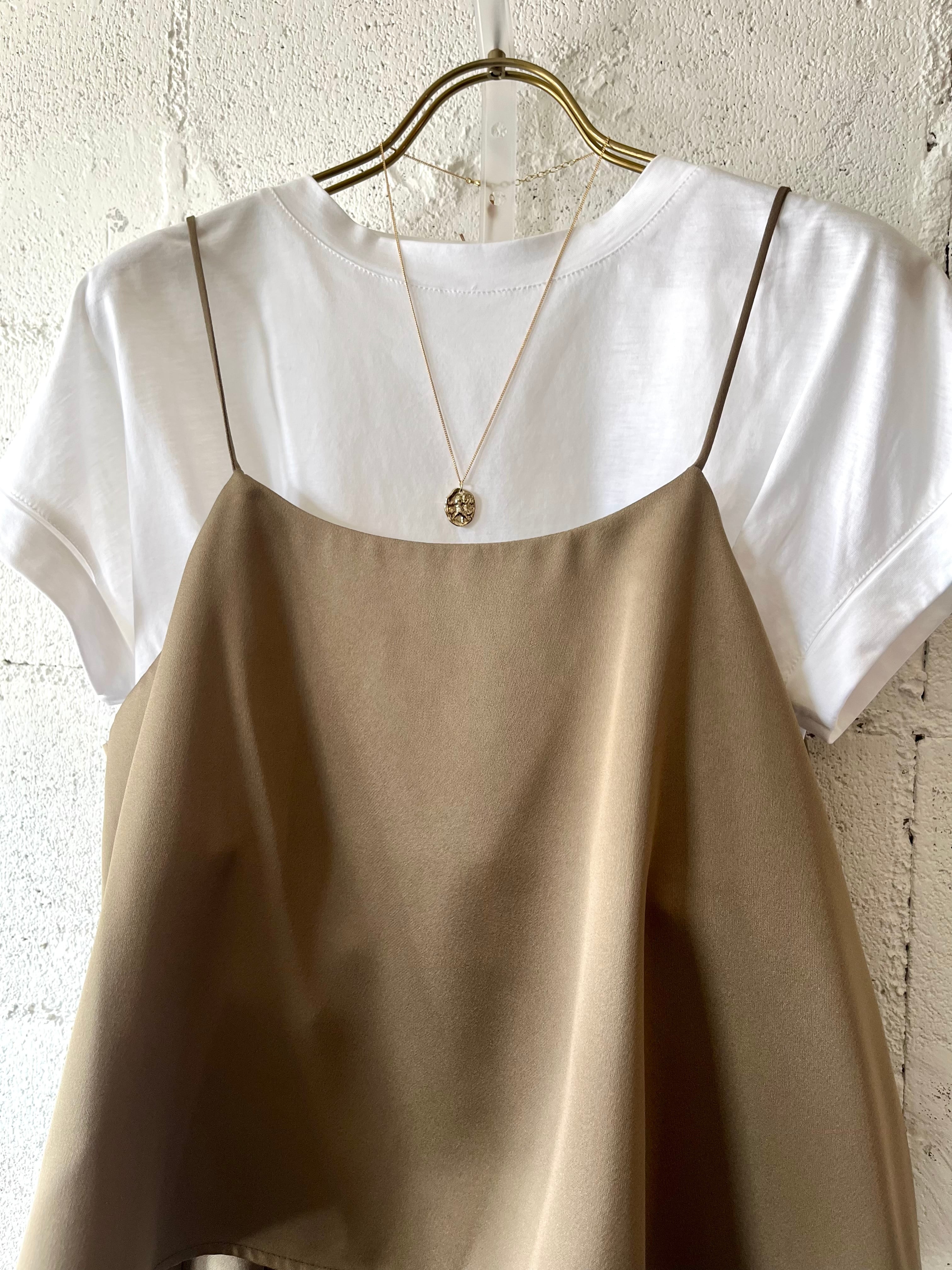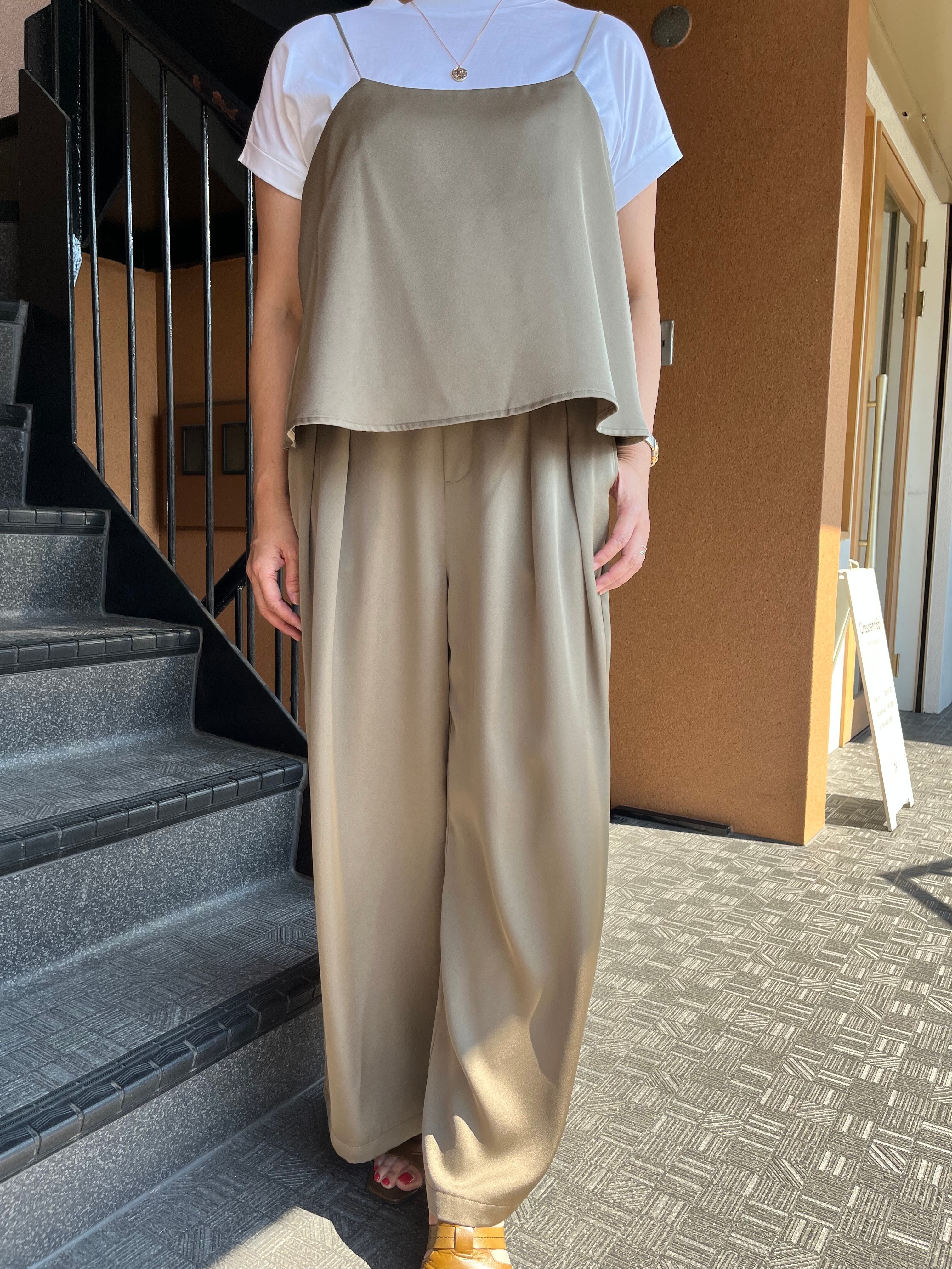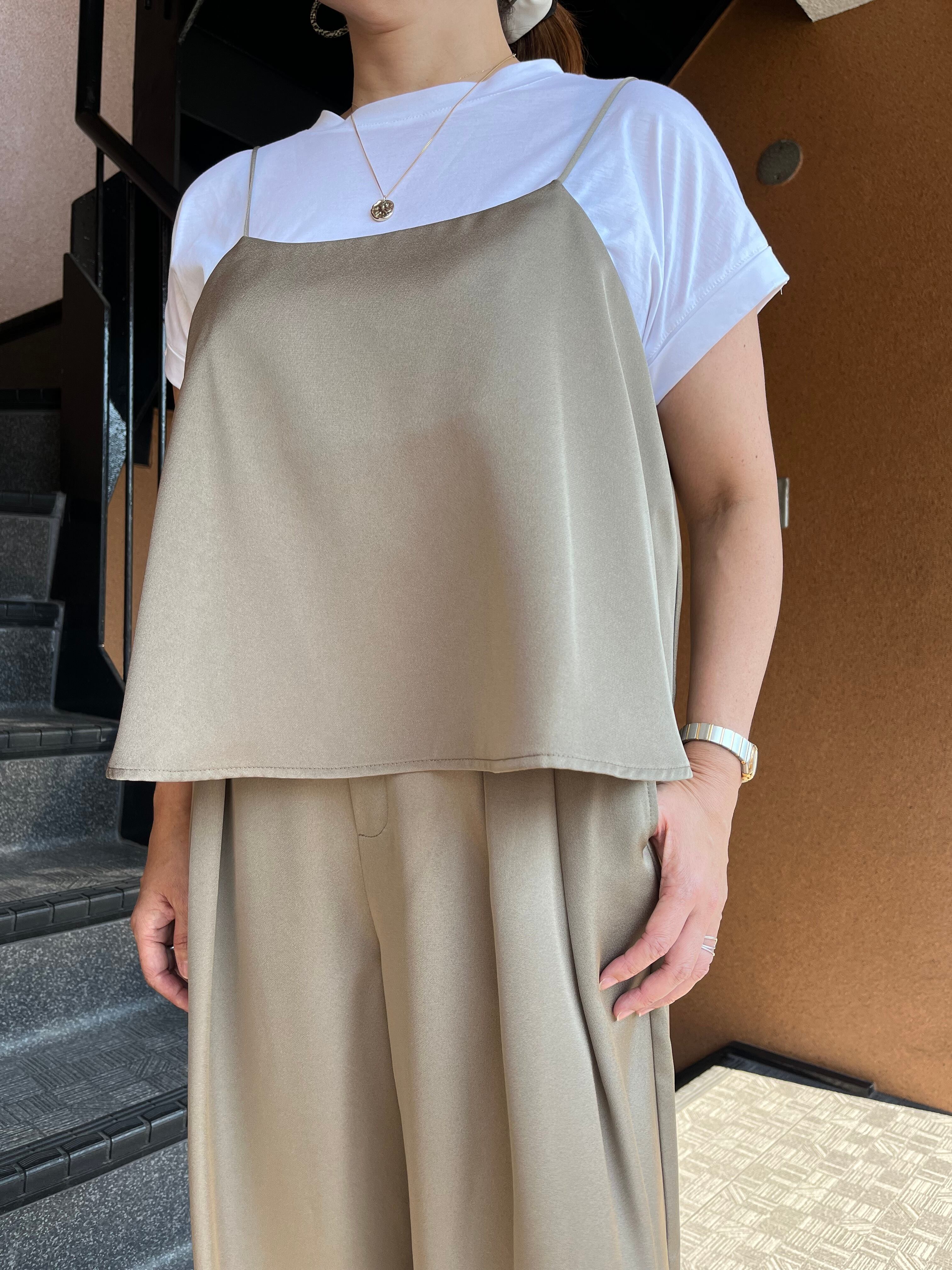 エレガントなマットサテン生地を使用したキャミとパンツのセットアップ。滑らかな肌触りが心地よく、ドレッシーな印象を与えるアイテムです。サテン特有の光沢が、カジュアルなシーンでも一際目を引く存在感を演出します。