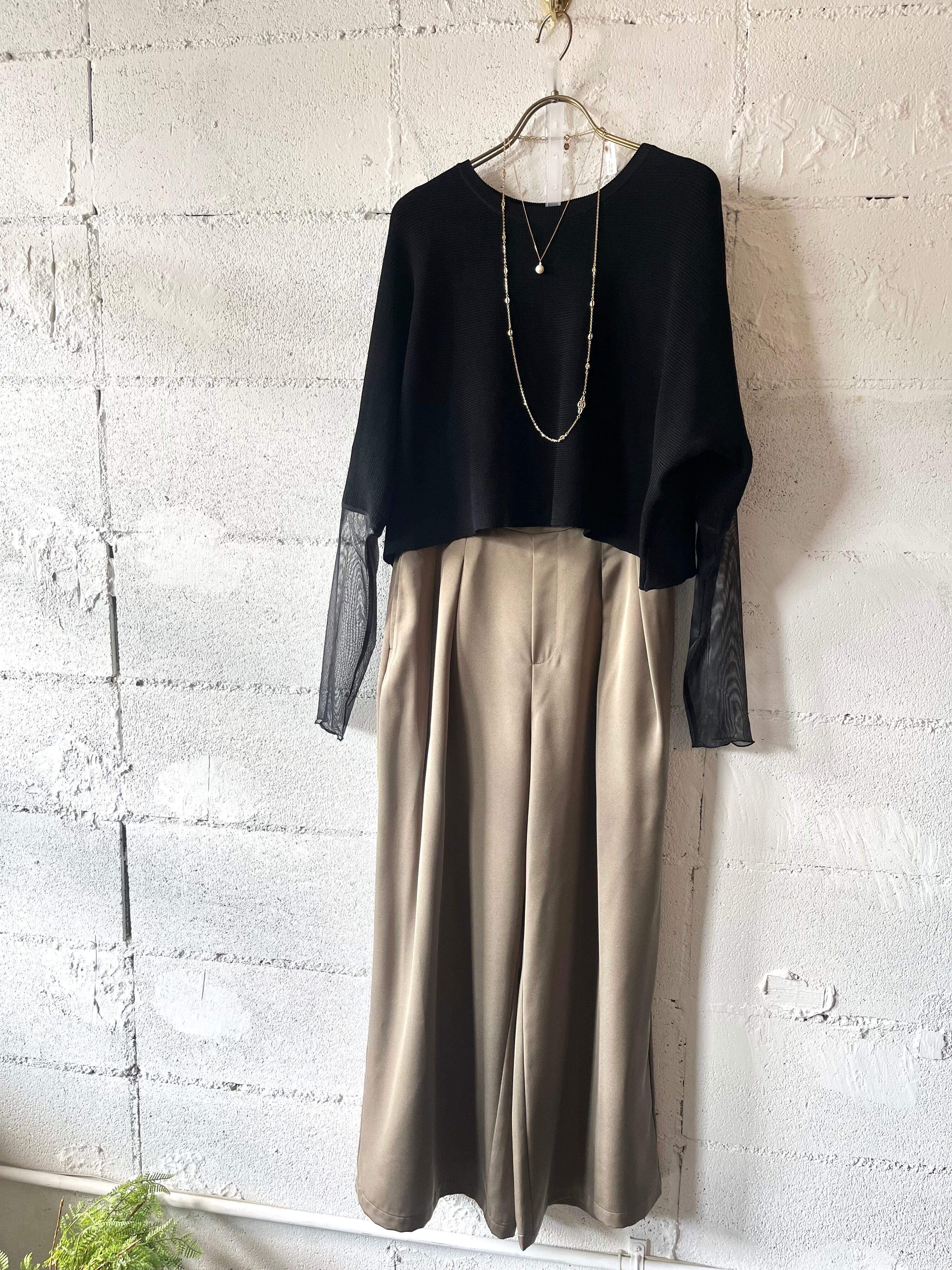 キャミはシンプルながらも女性らしさを引き立てるデザインで、パンツはリラックス感がありつつもきちんと感があるシルエット。お出かけから特別なイベントまで、幅広いシーンで活躍すること間違いなしです。カーキ、ブラックの2色展開で、あなたのスタイルに合った色をぜひお選びください。この春夏、ワードローブに加えて特別な一着にしてみませんか!